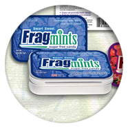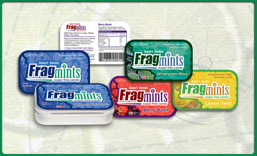 Fragmints is a xylitol sweetened mint candy. all the peices of candy have a fractured look